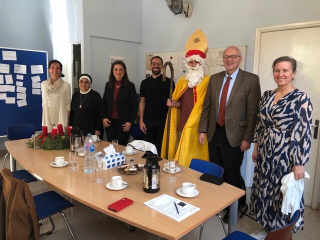 رافق سيادته خلال الزيارة السيدة الدكتورة/ سيلكى ألبين رئيسة القسم العلمي والعلاقات الخارجية ، والسيد الدكتور/ يوان فيلاين الأستاذ بجامعة هومبولت ببرلين. كان الوفد في زيارة للقاهرة لبحث المنح الدراسية البرلمانية التي تقدم سنوياً. بعد زيارة الفصل 1/أ و التحاور مع طالبات الفصل 10/أ قام القديس نيكولاوس أيضا بالترحيب بضيوف المدرسة القادمين من برلين.
