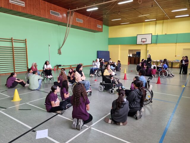 شارك في سباق التتابع أربع فرق مختلطة تكونت من طالبات النشاط الاجتماعي وحوالي 14 صبي وفتاة على كراسي متحركة.
