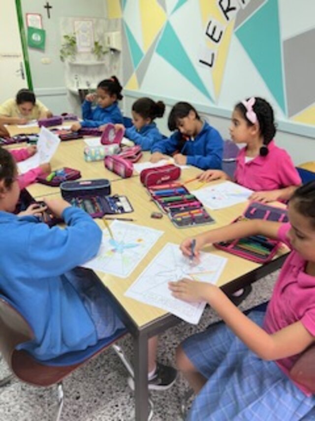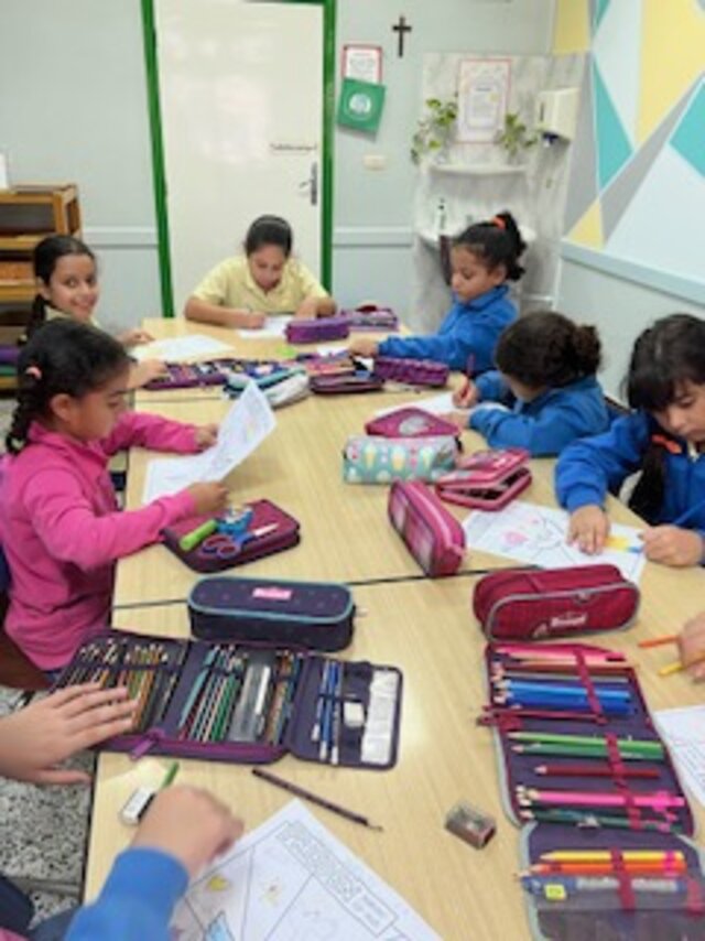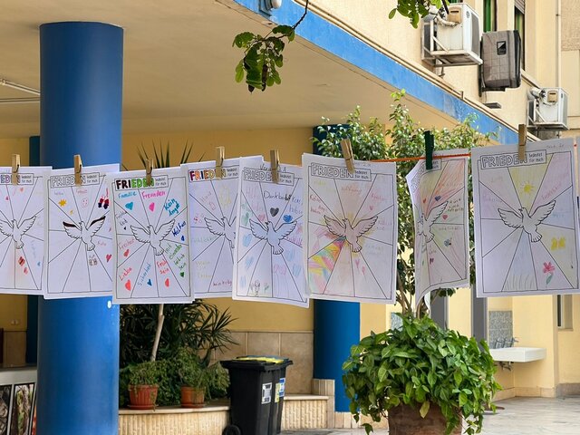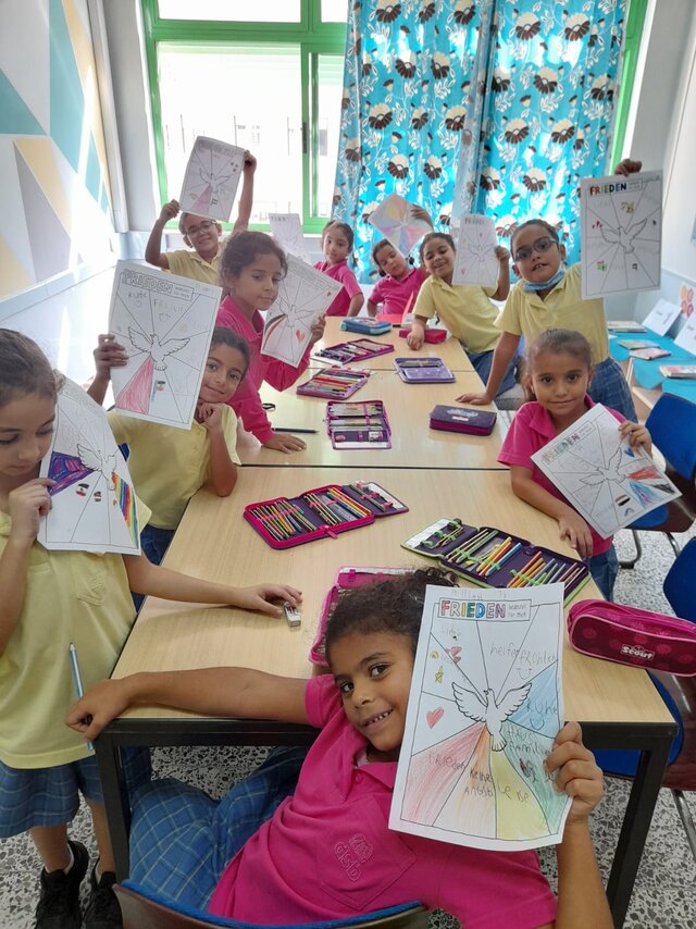 خلال الأسبوع الماضي تحدثت تلميذات المرحلة الابتدائية في إطار مادة التعليم الاجتماعي عن مشاعرهن وأفكارهن وأيضًا عن مخاوفهن فيما يتعلق بالأحداث التالية. وتحت شعار "الأطفال يدعمون الأطفال" قامت التلميذات بكتابة رسائل سلام ضد العنف وقمن بعرضها في فناء المدرسة.