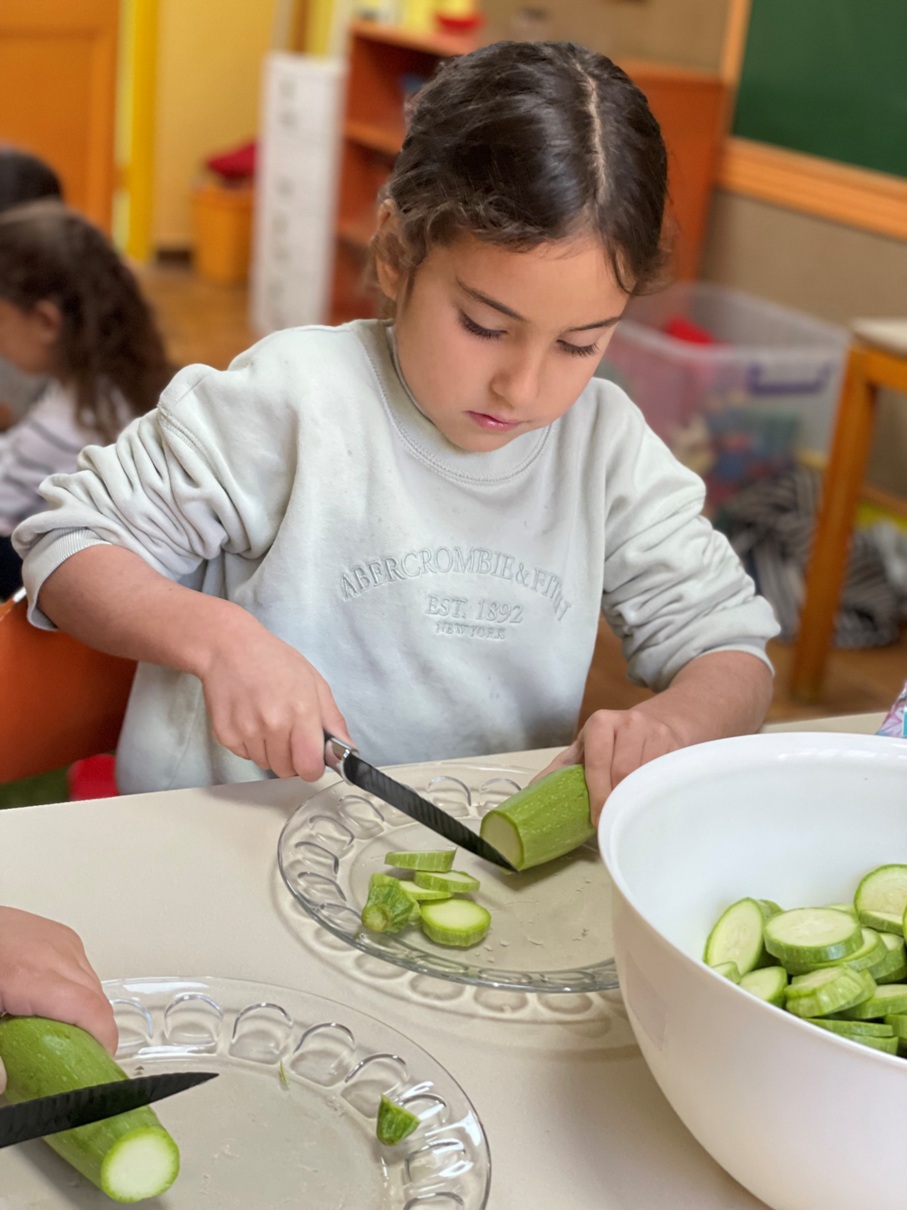 عند عودتهن إلى الحضانة، قامت الصغيرات بغسل الخضروات وتقشيرها وتقطيعها إلى شرائح صغيرة بسكاكين مناسبة. ثم تم طهي الخضروات وهرسها. انتشرت رائحة حساء الكوسة اللذيذ في جميع أنحاء الحضانة.