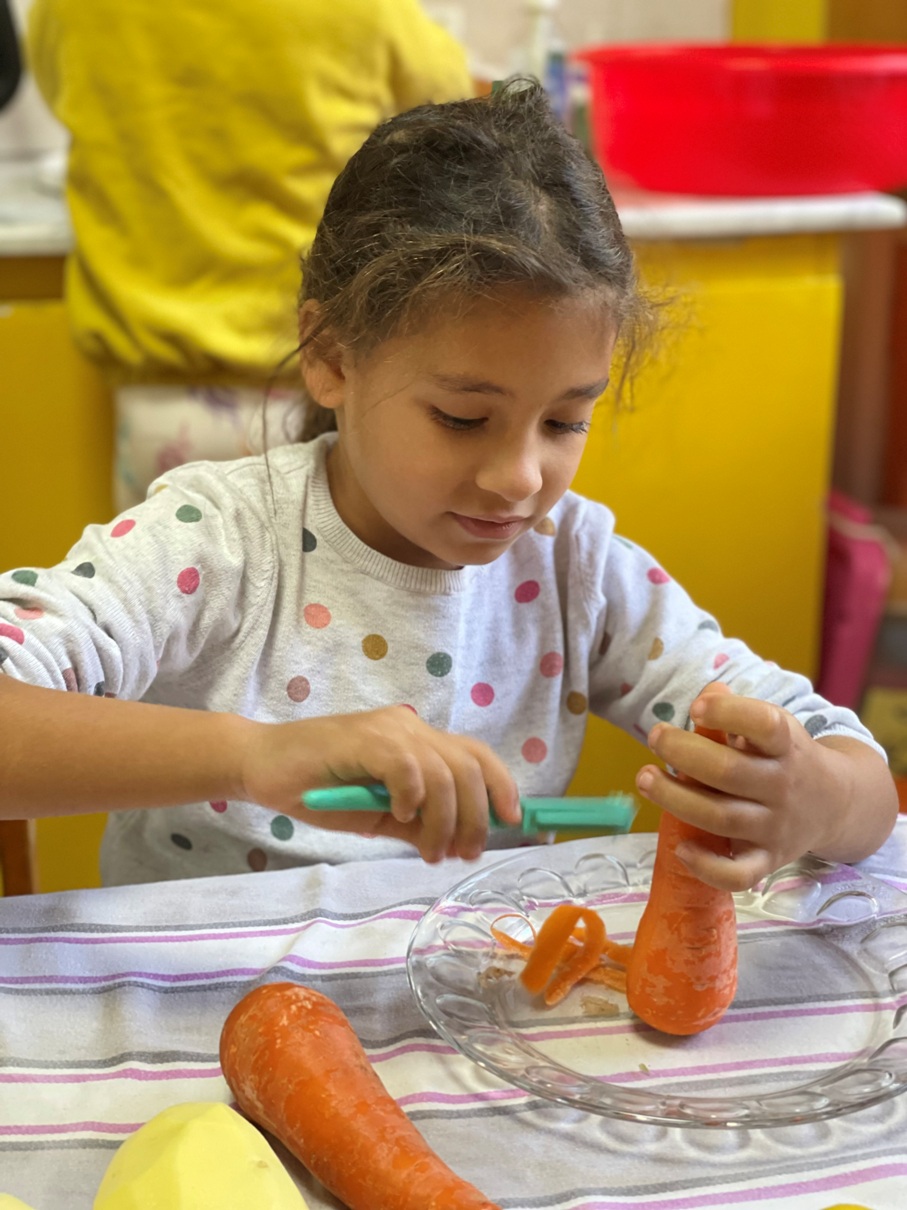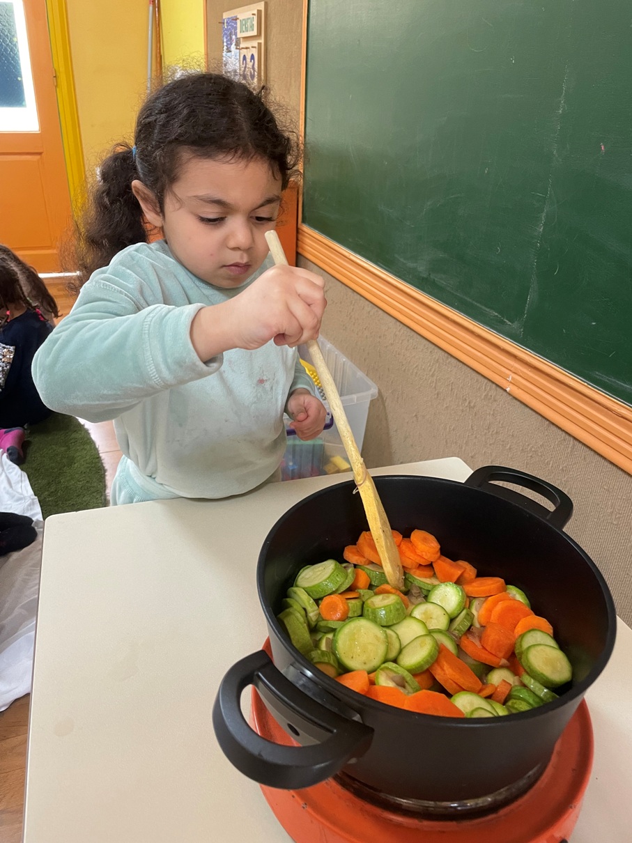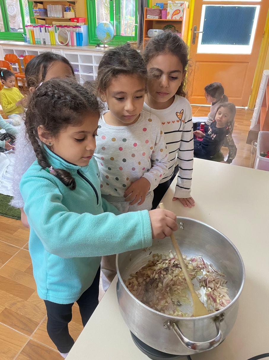 ثم اقترحت معلمات الحضانة أن تشترك المجموعة في طهي حساء خضروات صحي. أظهرت الصغيرات سعادة بالغة بالتخطيط الجماعي وطهو الحساء معًا.